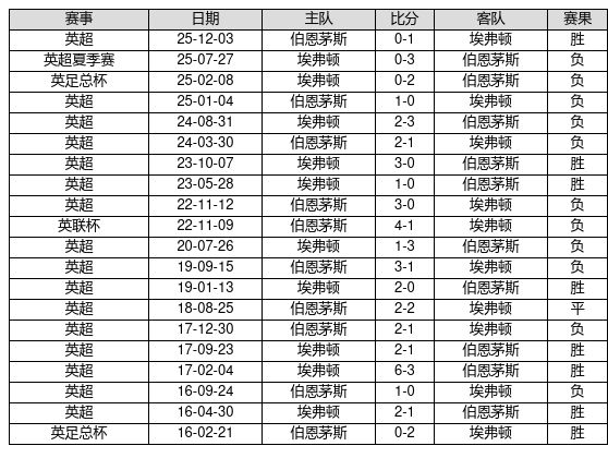 埃弗顿 VS 伯恩茅斯两队近10年的交战次数为20场,埃弗顿8胜1平11负,赢球概率为40.0%,平局概率为5.0%,输球概率为55.0%。