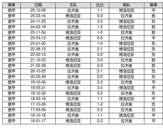 博洛尼亚 VS 拉齐奥两队近10年的交战次数为21场,博洛尼亚5胜7平9负,赢球概率为23.8%,平局概率为33.3%,输球概率为42.9%。
