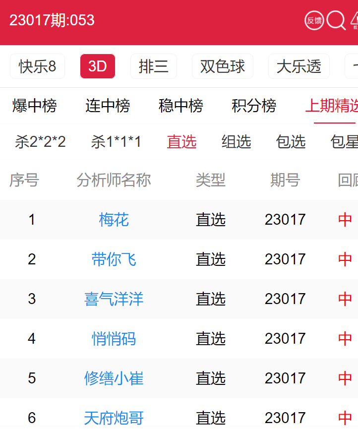 23018期:福彩3D 梅花、带你飞 等多位老师命中直选!