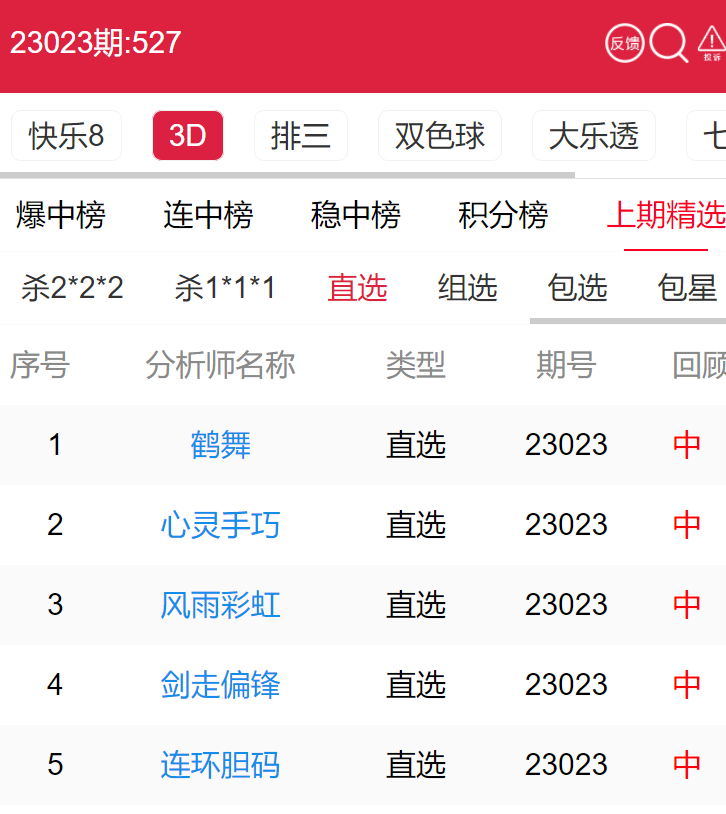 23024期:福彩3D 鹤舞、心灵手巧 等5位老师命中直选!