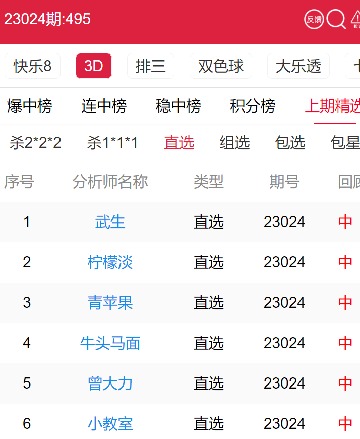 23025期:福彩3D 武生、柠檬淡 等7位老师命中直选!