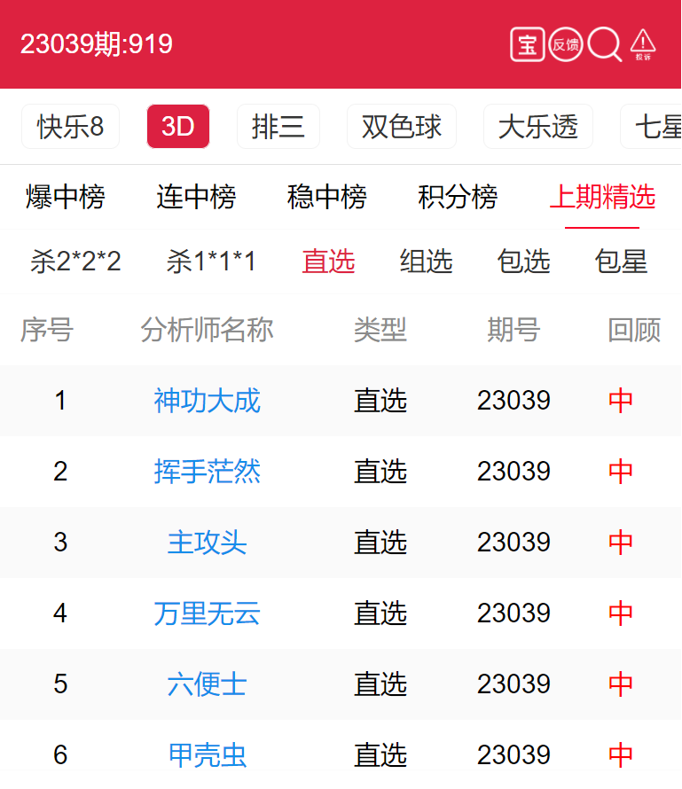 23040期:福彩3D 神功大成、挥手茫然 等15位老师命中直选!