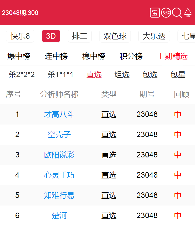 23049期:福彩3D 才高八斗、欧阳说彩 等13位老师命中直选!