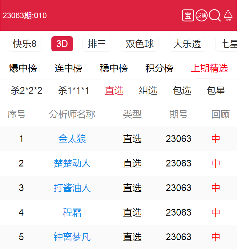 23064期:福彩3D 金太狼、楚楚动人 等12位老师命中直选!