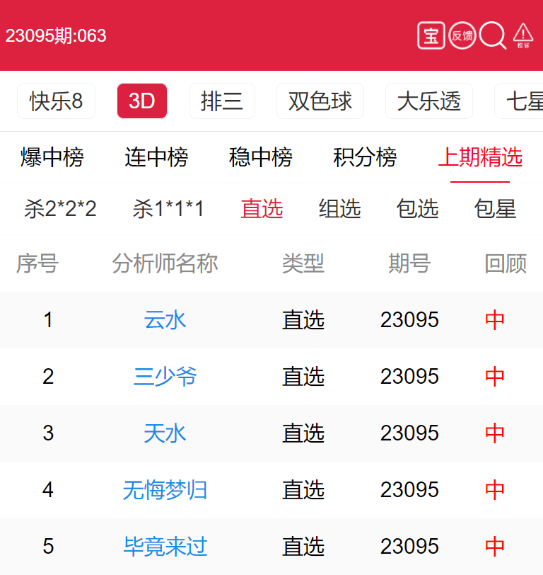 23096期:福彩3D 云水、三少爷 等10位老师命中直选!