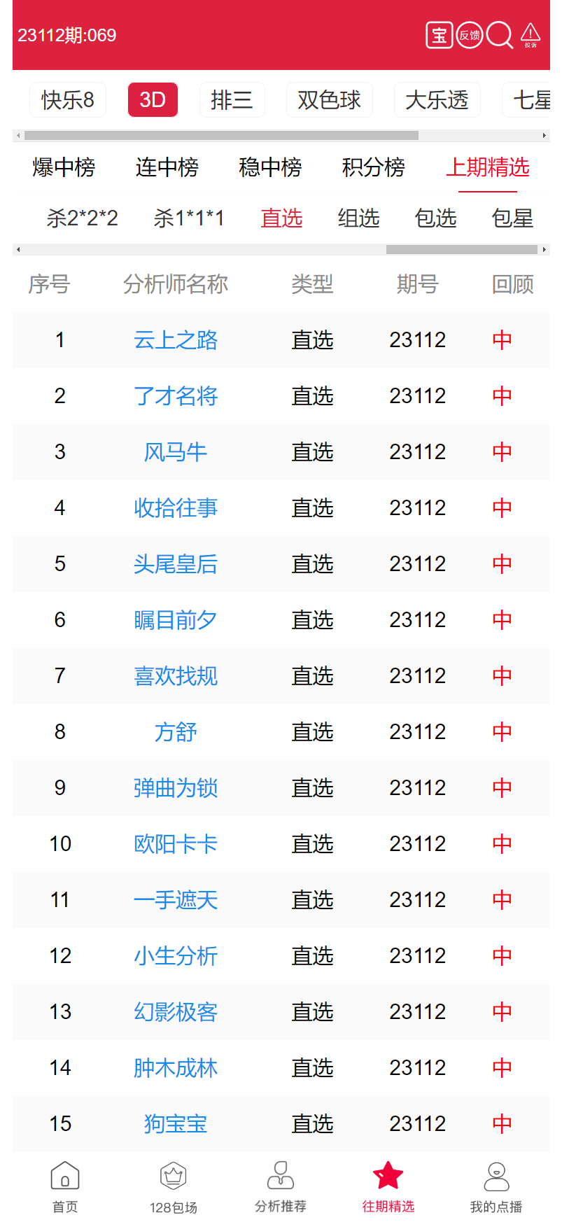 23113期:福彩3D 云上之路、了才名将 等15位老师命中直选!