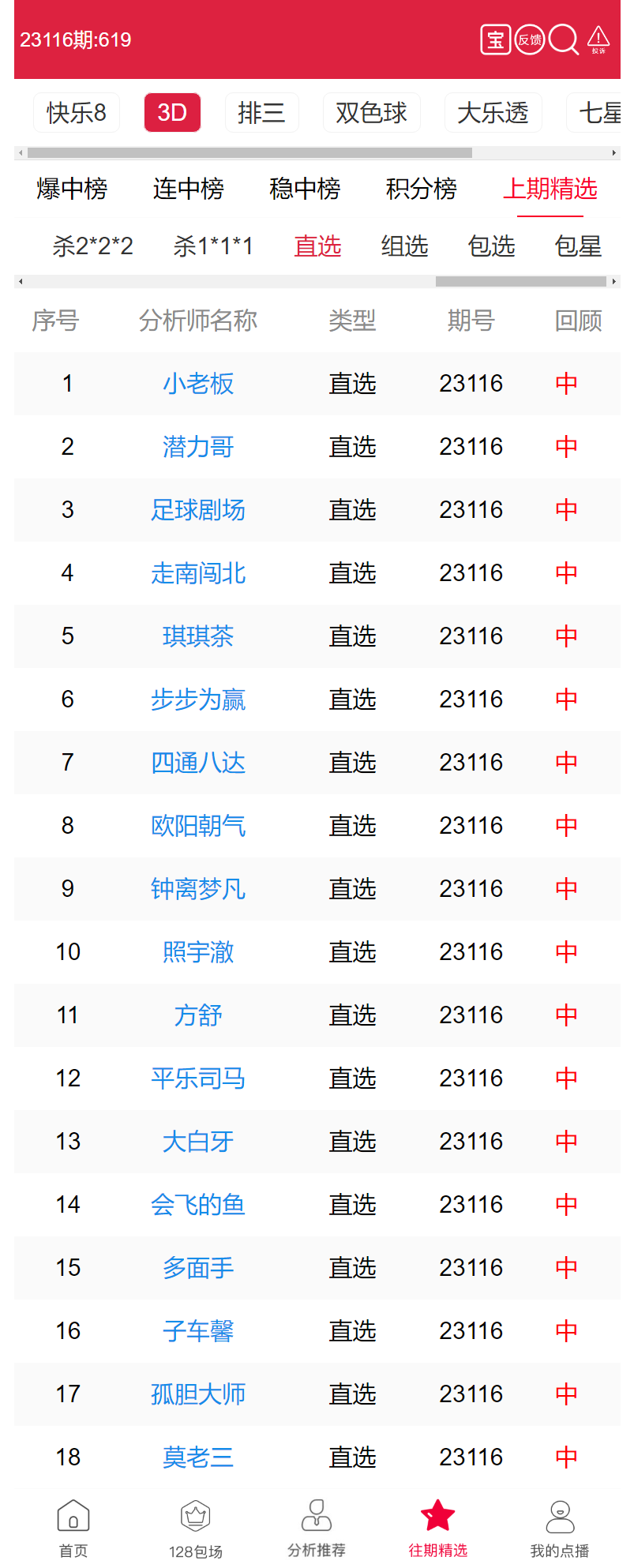 23117期:福彩3D 小老板、潜力哥 等18位老师命中直选!