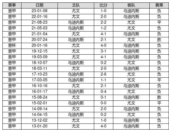 乌迪内斯 VS 尤文两队近10年的交战次数为21场,乌迪内斯2胜3平16负,赢球概率为9.5%,平局概率为14.3%,输球概率为76.2%。
