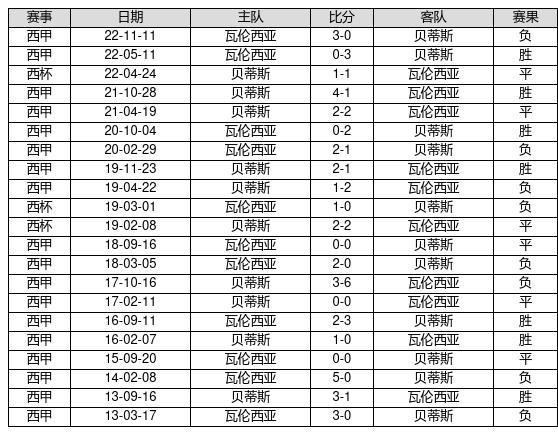 贝蒂斯 VS 瓦伦西亚两队近10年的交战次数为21场,贝蒂斯7胜6平8负,赢球概率为33.3%,平局概率为28.6%,输球概率为38.1%。