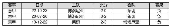 莱切 VS 博洛尼亚两队近10年的交战次数为3场,莱切0胜0平3负,赢球概率为0%,平局概率为0%,输球概率为100%。