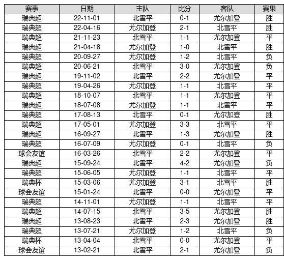 尤尔加登 VS 北雪平两队近10年的交战次数为25场,尤尔加登8胜11平6负,赢球概率为32%,平局概率为44%,输球概率为24%。
