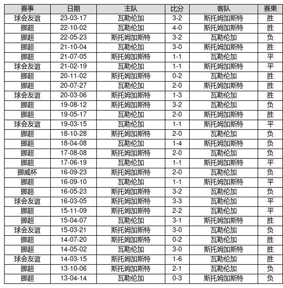 瓦勒伦加 VS 斯托姆加斯特两队近10年的交战次数为28场,瓦勒伦加11胜7平10负,赢球概率为39.3%,平局概率为25%,输球概率为35.7%。