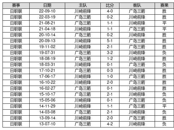 川崎前锋 VS 广岛三箭两队近10年的交战次数为20场,川崎前锋11胜3平6负,赢球概率为55%,平局概率为15%,输球概率为30%。