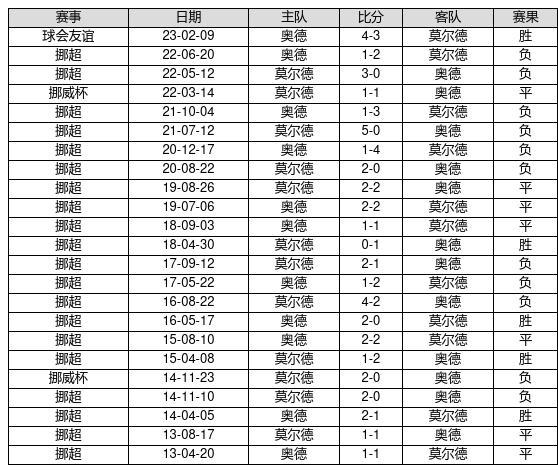 奥德 VS 莫尔德两队近10年的交战次数为23场,奥德5胜7平11负,赢球概率为21.7%,平局概率为30.4%,输球概率为47.8%。