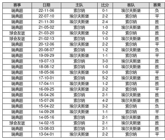 索尔纳 VS 埃尔夫斯堡两队近10年的交战次数为23场,索尔纳13胜7平3负,赢球概率为56.5%,平局概率为30.4%,输球概率为13%。