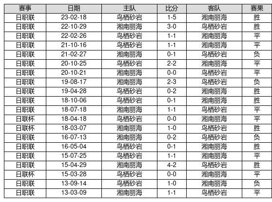 湘南丽海 VS 鸟栖砂岩两队近10年的交战次数为20场,湘南丽海7胜9平4负,赢球概率为35%,平局概率为45%,输球概率为20%。