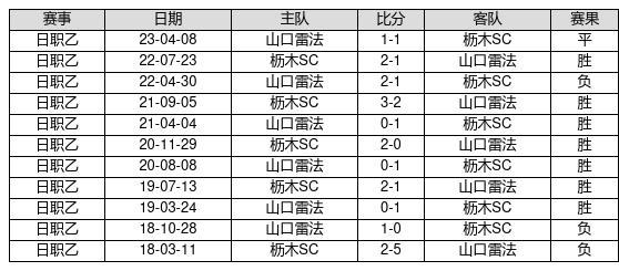 枥木SC VS 山口雷法两队近10年的交战次数为11场,枥木SC7胜1平3负,赢球概率为63.6%,平局概率为9.1%,输球概率为27.3%。