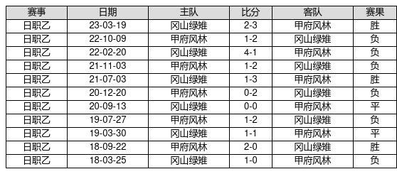 甲府风林 VS 冈山绿雉两队近10年的交战次数为11场,甲府风林3胜2平6负,赢球概率为27.3%,平局概率为18.2%,输球概率为54.5%。