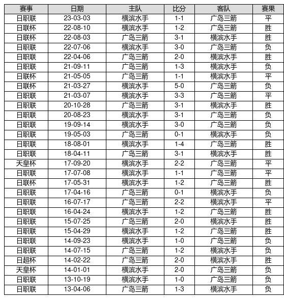 广岛三箭 VS 横滨水手两队近10年的交战次数为29场,广岛三箭11胜6平12负,赢球概率为37.9%,平局概率为20.7%,输球概率为41.4%。