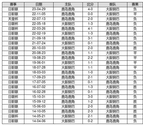 大阪钢巴 VS 鹿岛鹿角两队近10年的交战次数为24场,大阪钢巴6胜5平13负,赢球概率为25%,平局概率为20.8%,输球概率为54.2%。