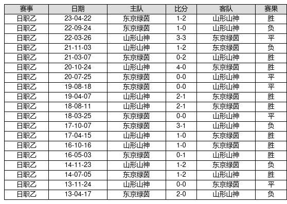 山形山神 VS 东京绿茵两队近10年的交战次数为19场,山形山神9胜5平5负,赢球概率为47.4%,平局概率为26.3%,输球概率为26.3%。