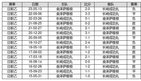 长崎成功丸 VS 金泽萨维根两队近10年的交战次数为15场,长崎成功丸7胜4平4负,赢球概率为46.7%,平局概率为26.7%,输球概率为26.7%。
