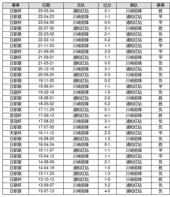 浦和红钻 VS 川崎前锋两队近10年的交战次数为32场,浦和红钻9胜9平14负,赢球概率为28.1%,平局概率为28.1%,输球概率为43.8%。