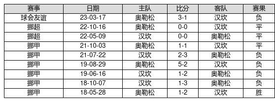 汉坎 VS 奥勒松两队近10年的交战次数为9场,汉坎1胜3平5负,赢球概率为11.1%,平局概率为33.3%,输球概率为55.6%。