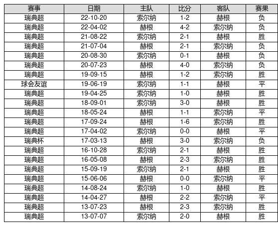 索尔纳 VS 赫根两队近10年的交战次数为22场,索尔纳11胜5平6负,赢球概率为50%,平局概率为22.7%,输球概率为27.3%。