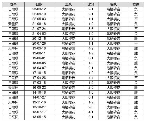鸟栖砂岩 VS 大阪樱花两队近10年的交战次数为23场,鸟栖砂岩9胜4平10负,赢球概率为39.1%,平局概率为17.4%,输球概率为43.5%。