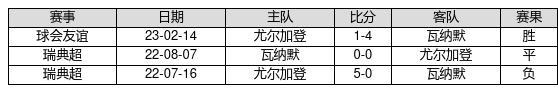 瓦纳默 VS 尤尔加登两队近10年的交战次数为3场,瓦纳默1胜1平1负,赢球概率为33.3%,平局概率为33.3%,输球概率为33.3%。