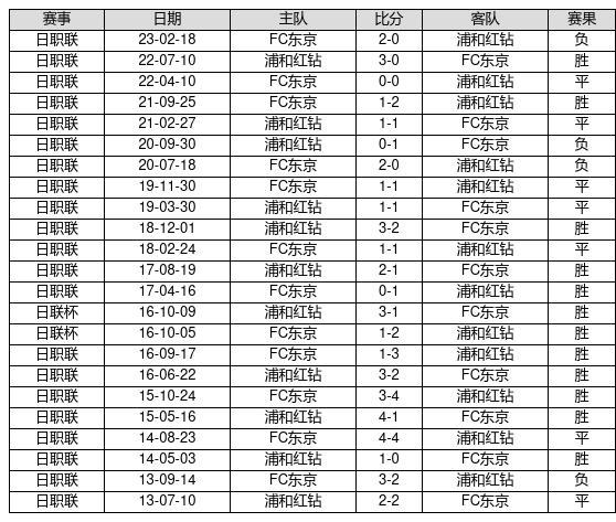 浦和红钻 VS FC东京两队近10年的交战次数为23场,浦和红钻12胜7平4负,赢球概率为52.2%,平局概率为30.4%,输球概率为17.4%。