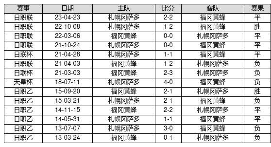 福冈黄蜂 VS 札幌冈萨多两队近10年的交战次数为14场,福冈黄蜂2胜6平6负,赢球概率为14.3%,平局概率为42.9%,输球概率为42.9%。