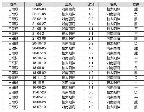 柏太阳神 VS 湘南丽海两队近10年的交战次数为21场,柏太阳神9胜7平5负,赢球概率为42.9%,平局概率为33.3%,输球概率为23.8%。