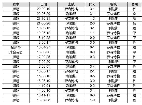 罗森博格 VS 利勒斯两队近10年的交战次数为20场,罗森博格13胜4平3负,赢球概率为65%,平局概率为20%,输球概率为15%。