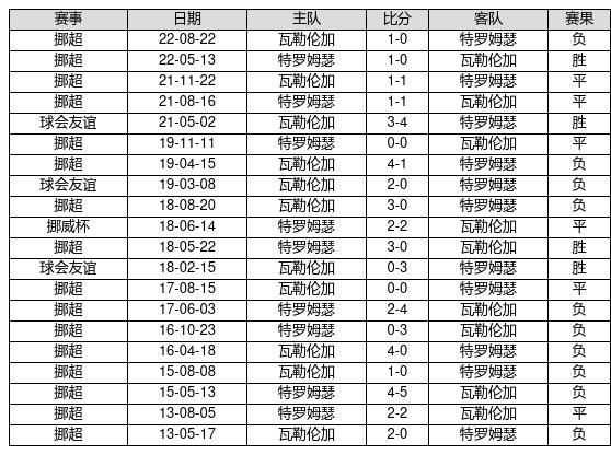 特罗姆瑟 VS 瓦勒伦加两队近10年的交战次数为20场,特罗姆瑟4胜6平10负,赢球概率为20%,平局概率为30%,输球概率为50%。