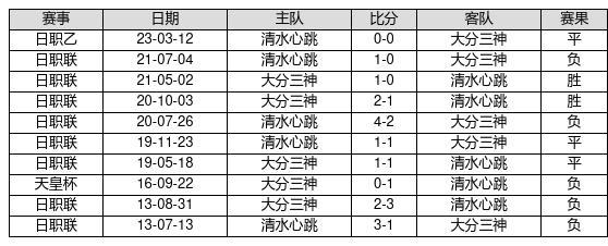大分三神 VS 清水心跳两队近10年的交战次数为10场,大分三神2胜3平5负,赢球概率为20%,平局概率为30%,输球概率为50%。