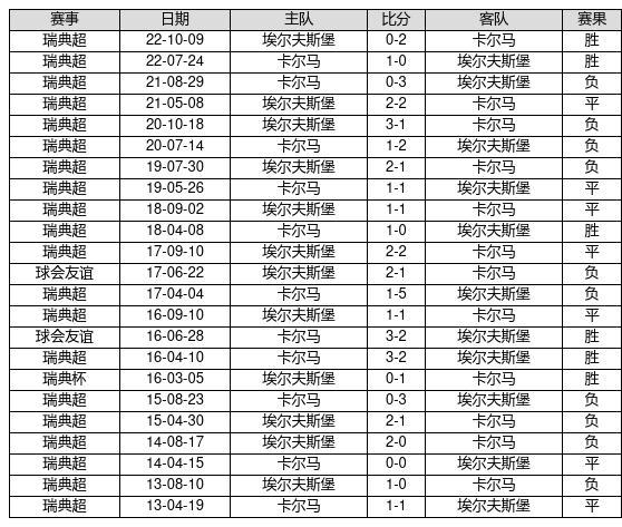 卡尔马 VS 埃尔夫斯堡两队近10年的交战次数为23场,卡尔马6胜7平10负,赢球概率为26.1%,平局概率为30.4%,输球概率为43.5%。