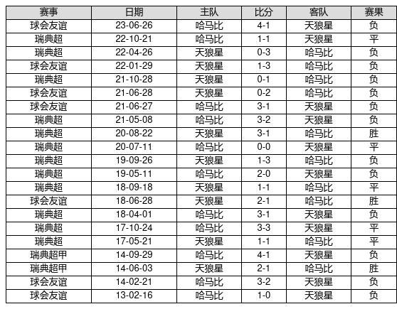 天狼星 VS 哈马比两队近10年的交战次数为21场,天狼星3胜5平13负,赢球概率为14.3%,平局概率为23.8%,输球概率为61.9%。