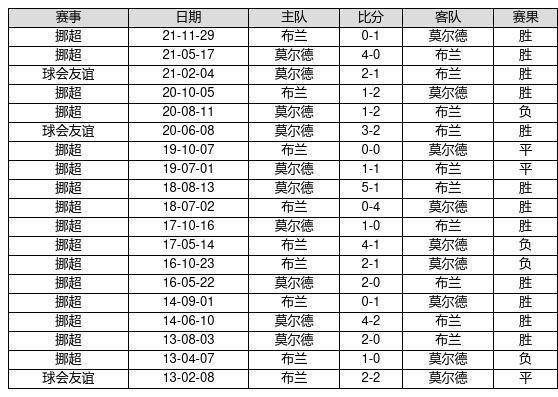 莫尔德 VS 布兰两队近10年的交战次数为19场,莫尔德12胜3平4负,赢球概率为63.2%,平局概率为15.8%,输球概率为21.1%。