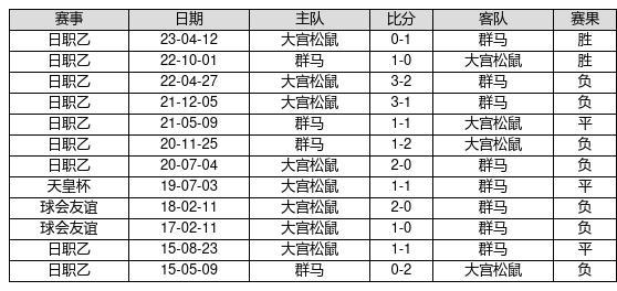 群马 VS 大宫松鼠两队近10年的交战次数为12场,群马2胜3平7负,赢球概率为16.7%,平局概率为25%,输球概率为58.3%。