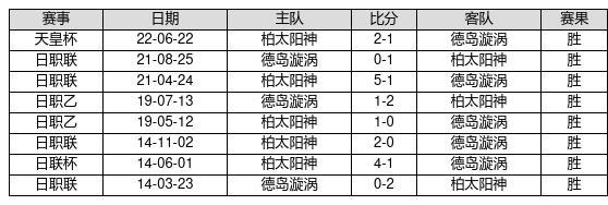 柏太阳神 VS 德岛漩涡两队近10年的交战次数为8场,柏太阳神8胜0平0负,赢球概率为100%,平局概率为0%,输球概率为0%。