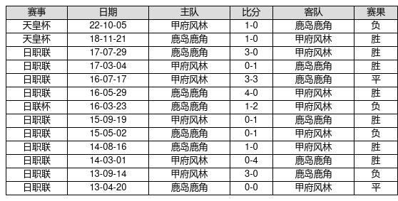 鹿岛鹿角 VS 甲府风林两队近10年的交战次数为13场,鹿岛鹿角7胜2平4负,赢球概率为53.8%,平局概率为15.4%,输球概率为30.8%。