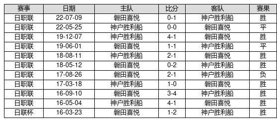 神户胜利船 VS 磐田喜悦两队近10年的交战次数为11场,神户胜利船8胜2平1负,赢球概率为72.7%,平局概率为18.2%,输球概率为9.1%。
