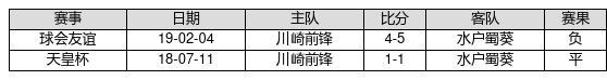 川崎前锋 VS 水户蜀葵两队近10年的交战次数为2场,川崎前锋0胜1平1负,赢球概率为0%,平局概率为50%,输球概率为50%。
