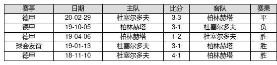 杜塞尔多夫 VS 柏林赫塔两队近10年的交战次数为5场,杜塞尔多夫3胜1平1负,赢球概率为60%,平局概率为20%,输球概率为20%。