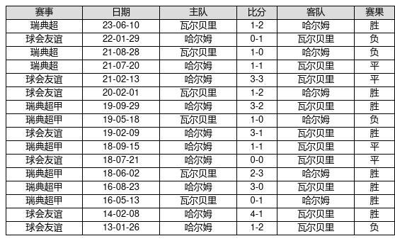 哈尔姆 VS 瓦尔贝里两队近10年的交战次数为16场,哈尔姆8胜4平4负,赢球概率为50%,平局概率为25%,输球概率为25%。