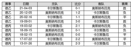 奥斯纳布吕克 VS 卡尔斯鲁厄两队近10年的交战次数为9场,奥斯纳布吕克2胜3平4负,赢球概率为22.2%,平局概率为33.3%,输球概率为44.4%。