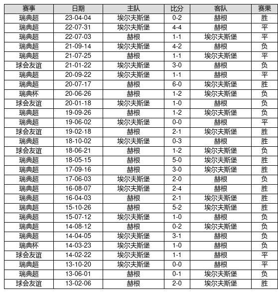 赫根 VS 埃尔夫斯堡两队近10年的交战次数为29场,赫根10胜7平12负,赢球概率为34.5%,平局概率为24.1%,输球概率为41.4%。