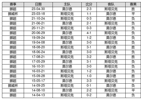 斯塔贝克 VS 莫尔德两队近10年的交战次数为19场,斯塔贝克4胜3平12负,赢球概率为21.1%,平局概率为15.8%,输球概率为63.2%。
